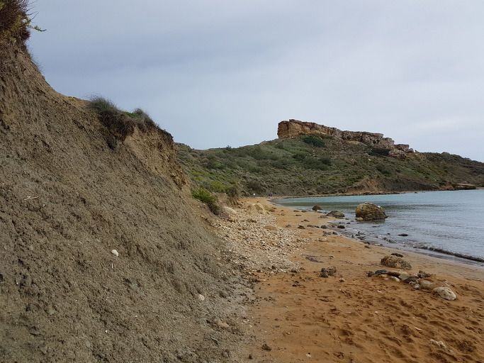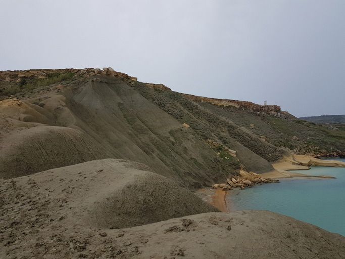 비가 조금 그치자 나는 홀로 저 언덕 너머에 있는 세 번째 만인 즈네이나만(Ġnejna [dʒˈnɛjna] Bay)을 구경하기 위해 해변을 따라간다. 그런데 여긴 점토가 해변 절벽을 이룬다. 마른 날이면 기어 올라가 지름길로 갈 수 있을텐데 말이다.
