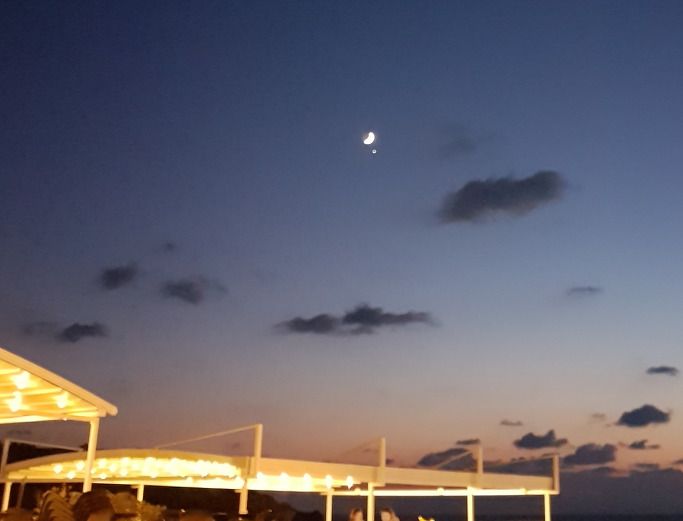 일몰과 작별하자 하늘에는 어느새 달이 밤길을 밝혀 준다. 달 아래 있는 작은 별이 궁금하다. 페이스북 친구이자 천문학자에 의하면 이 별은 이날 달에 아주 가까이에 위치한 목성이다.