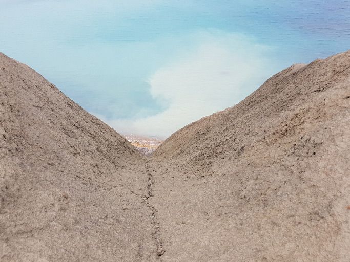 바로 비가 골을 만들어 점토를 쓸고 가서 만들어내는 색깔이다. 얼핏보면 하얀 구름이 바닷물에 투영된 듯하다. 바람이 억세게 분다. 사방천지에 혼자다. 저 가파른 찰흙 미끄럼틀로 발을 헛딛을까해서 공포감이 나를 사로잡는다.