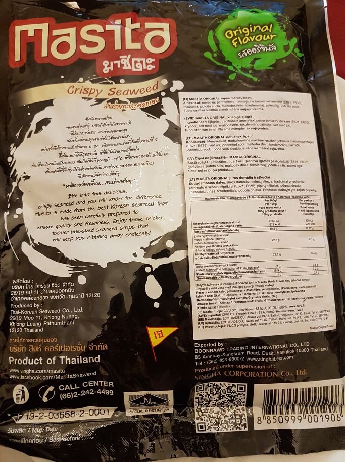 궁금증이 일어났다. 뒷봉지를 자세히 읽어보니 태국-한국 회사가 한국산 해조류로 태국에서 제조해 유럽으로 수출한 제품이다. 자세한 식품 내용물은 핀란드어, 스웨덴어, 에스토니아어, 라트비아어 그리고 리투아니아어로 설명되어 있다.