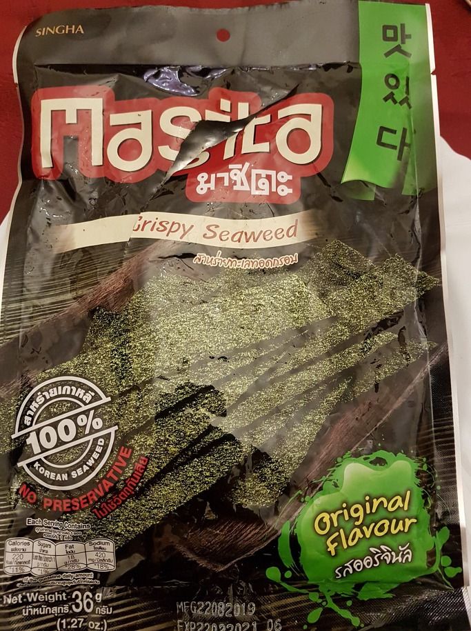 "맛있다"를 로마자로 표기한 듯한 "Masita"가 보인다. "맛있다"가 없다면 "Masita"를 "마시타 혹은 마시따"로 읽어 한글을 쉽게 떠올릴 수 없겠다. 내가 알고 있는 "맛있다"의 로마자 표기는 "masitda" 또는 "masitta"다. 한글 서체도 좀 세련되지 않아 보인다. 영어로 한국산 해조류(Korean seaweed)라고 쓰여 있는 것을 보니 적어도 한국하고 관련이 있는 듯하다.