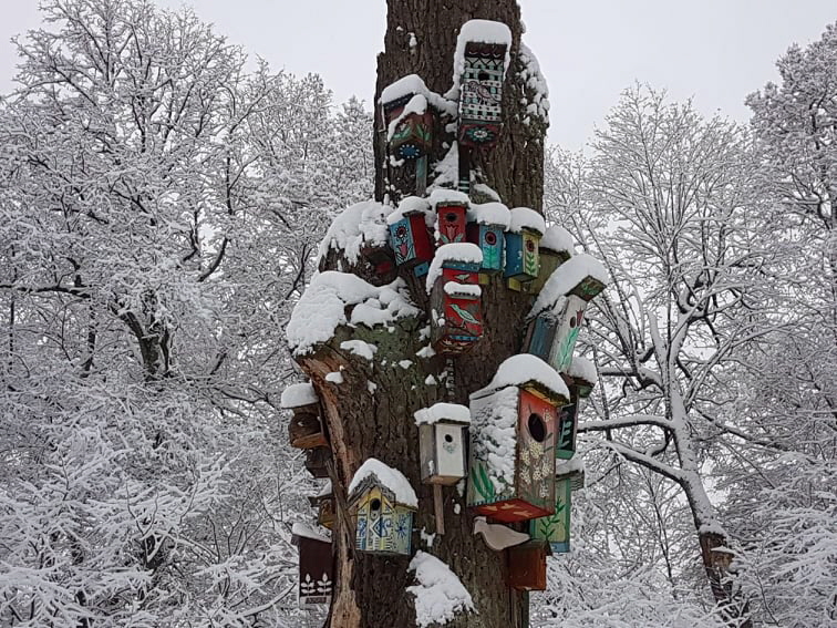 하얀 눈 모자를 쓰고 있는 알록달록한 인공새집이 새들에 대한 사람들의 배려만큼 돋보인다.