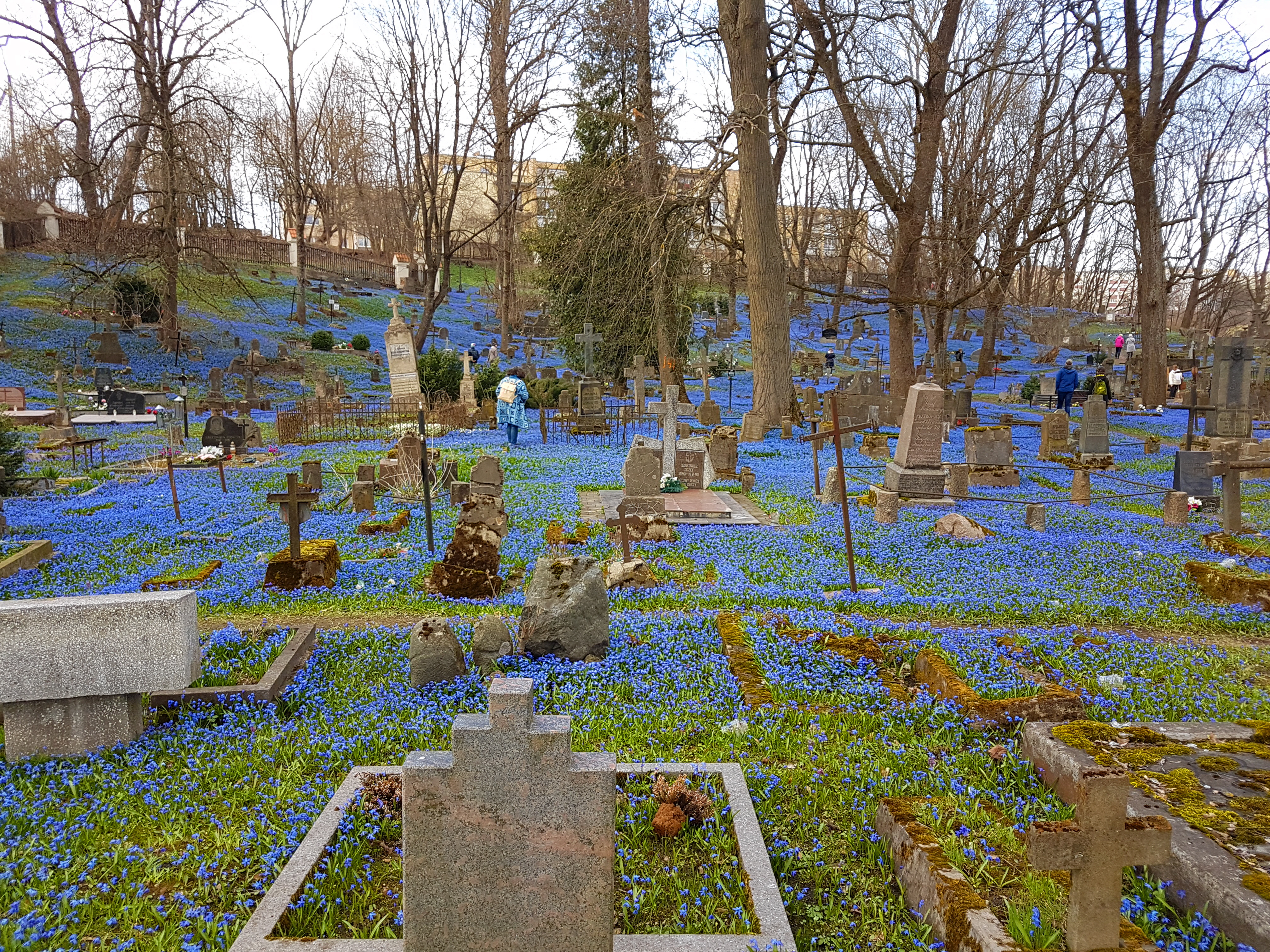 묘지는 강변 언덕에 자리잡고 있다. 언덕도 온통 파란색으로 물어들어 있다.