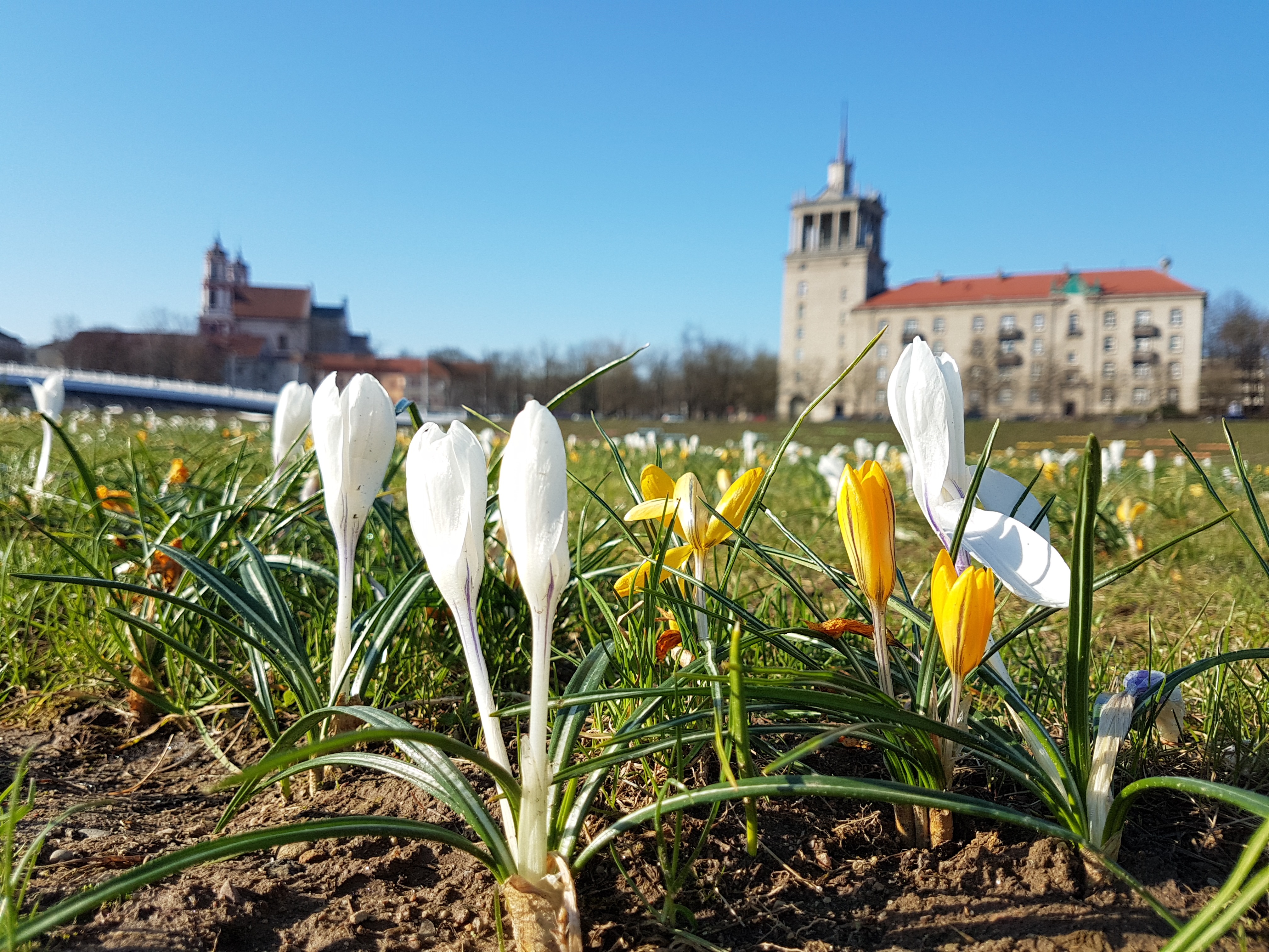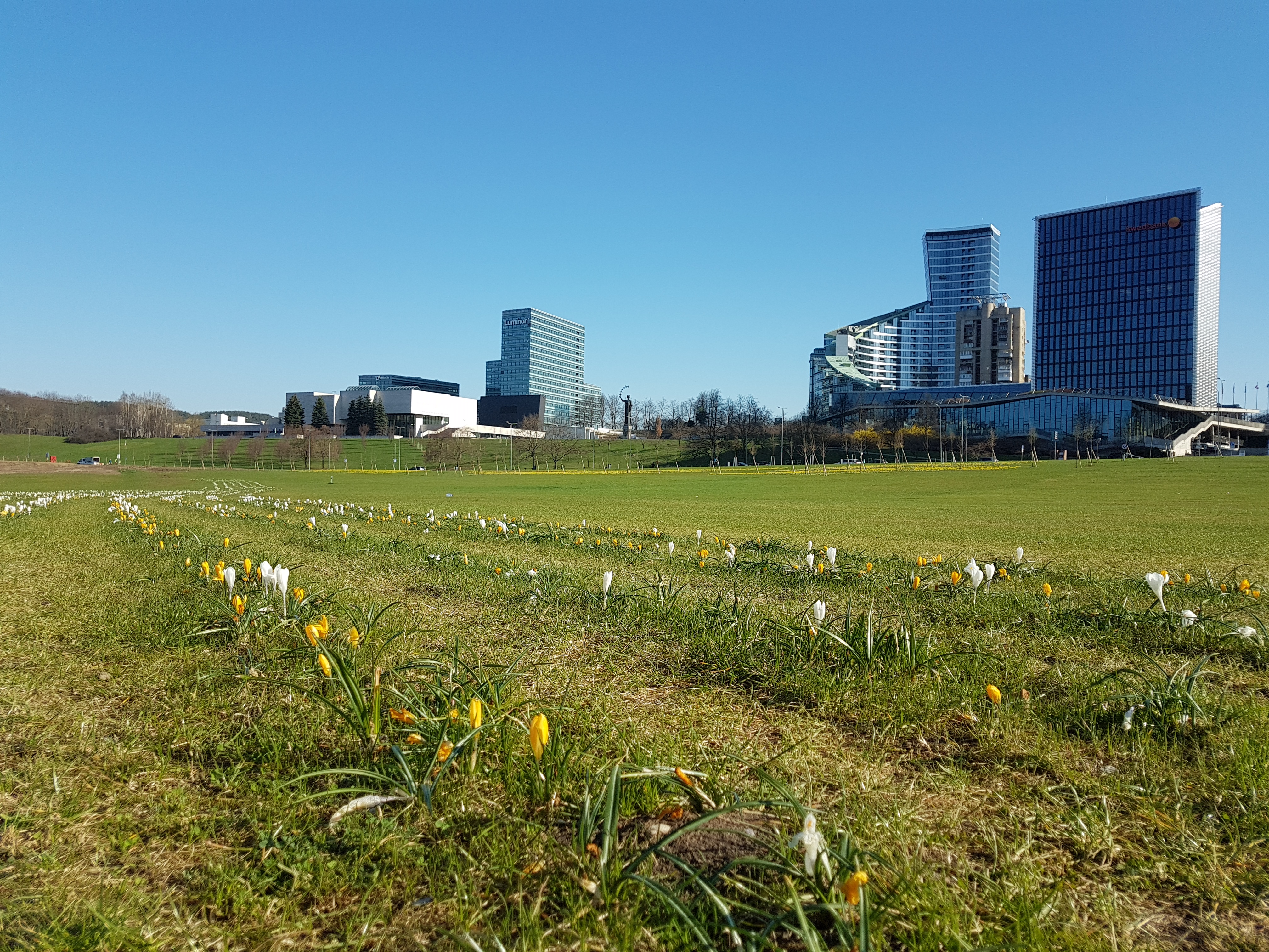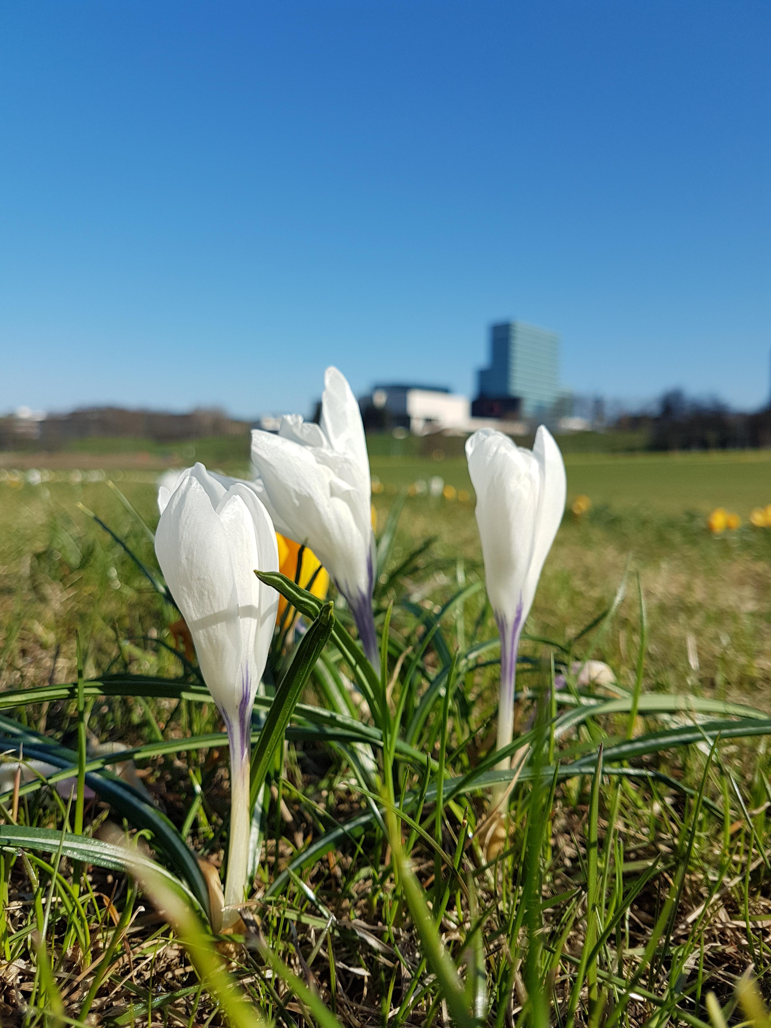 며칠 전 아침부터 맑은 날씨라 이곳을 산책겸 다녀왔다. 잔디밭에는 여러 줄로 심어놓은 크로커스 수천 송이가 노란색 혹은 하얀색 꽃을 피우고 있었다.