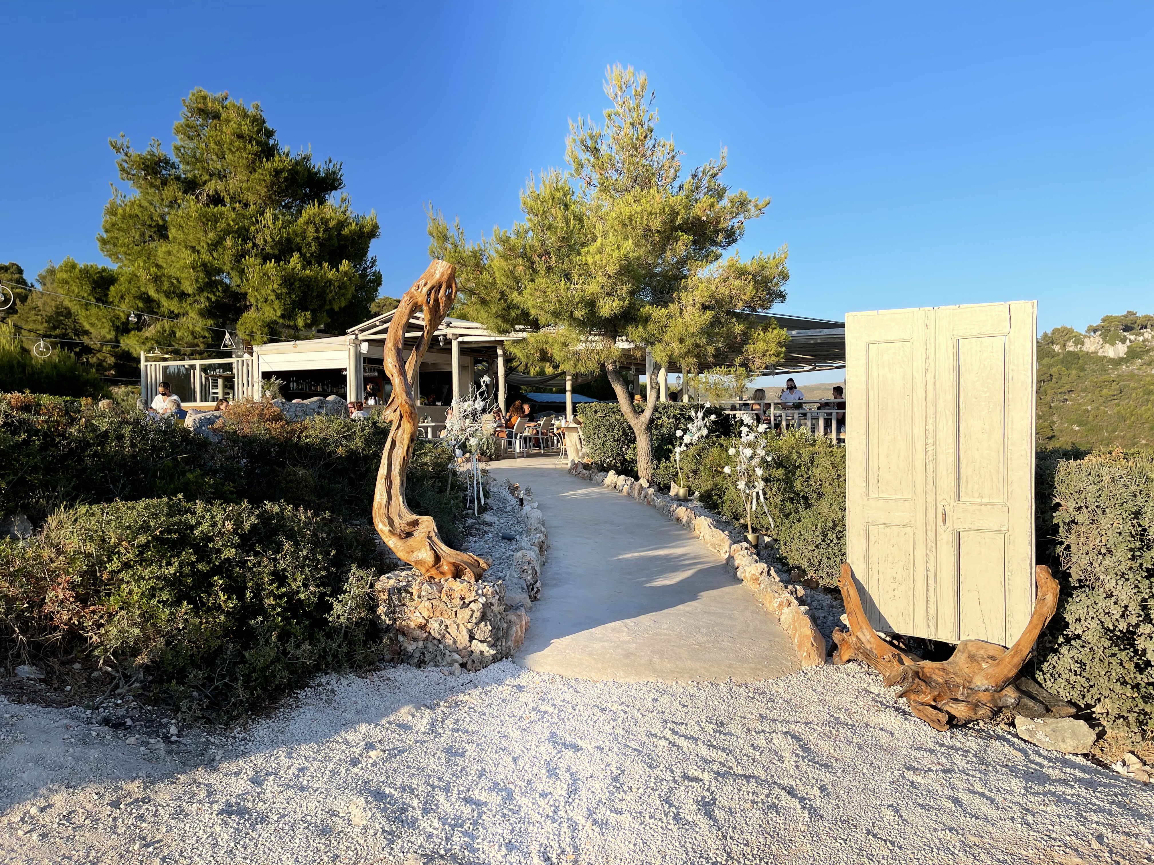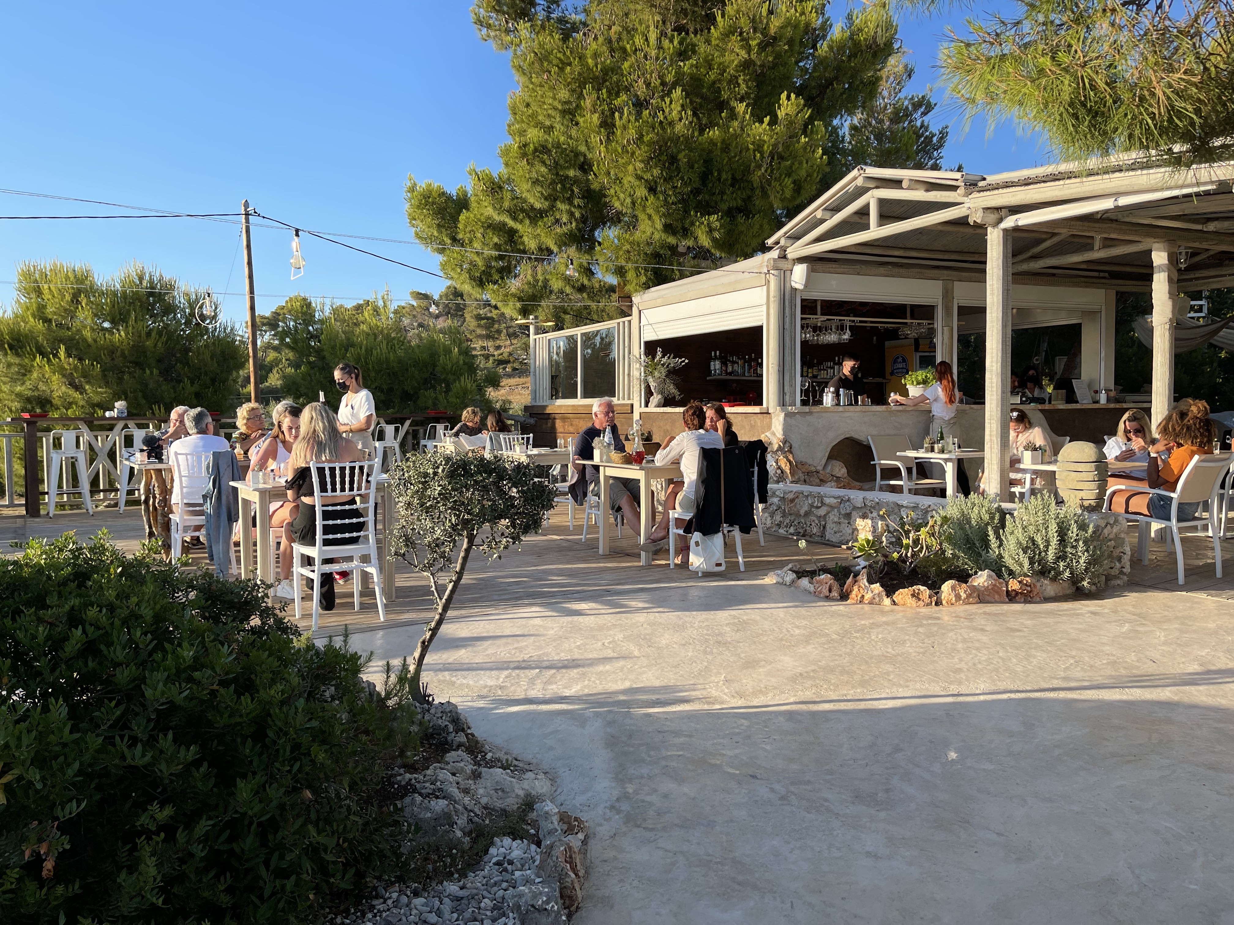식당 이름에서 알 수 있듯이 후자가 석양을 조망하기에는 훨씬 좋다. 전자는 언덕의 평평한 정상에 자리하고 있고 후자는 언덕 낭떠러지 바로 끝에 자리하고 있다. 선셋 아갈라스 식당 테라스에서 가파른 산비탈과 조금 멀리 떨어져 있는 이오니아해가 보인다. 그리고 소나무 두 가지 사이로 바다로 떨어지는 해를 더 실감나게 볼 수 있다.