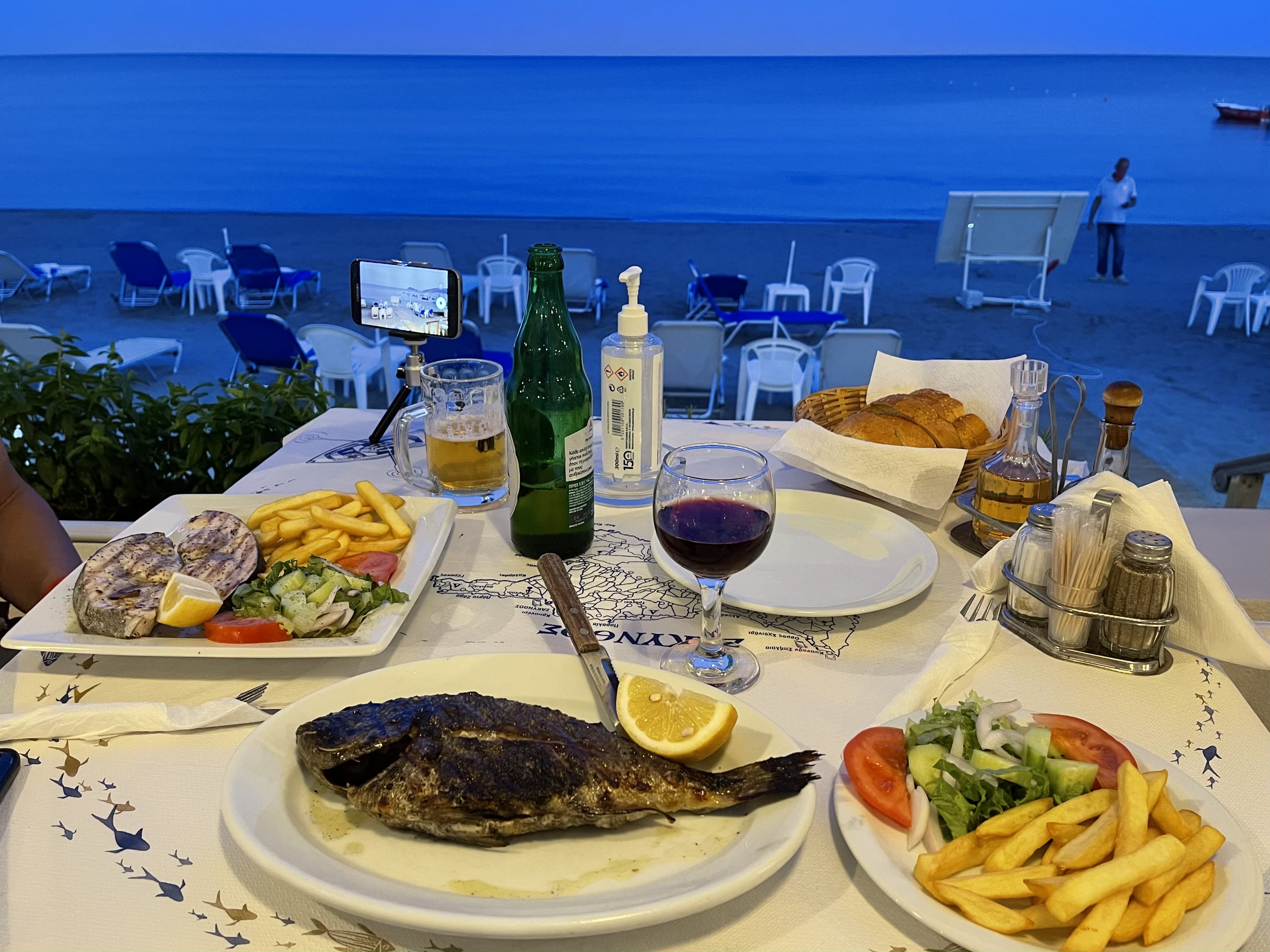 이렇게 두 사람이 식사를 하니 비용이 25유로에서 35유로 사이다. 음식값도 맥주값도 리투아니아 사람들에게 부담으로 느껴지지 않아서 좋다. 주요리만 주문했는데 전식과 후식에 가까운 음식까지 내어주는 그리스 자킨토스 식당들이 오래오래 기억될 것이다. 이러니 굳이 호텔 간이주방을 사용할 필요가 없게 되었다. 호텔에서 아침을 먹고 밖에서 하루 한 끼를 먹어도 몸이 만족해 했다.