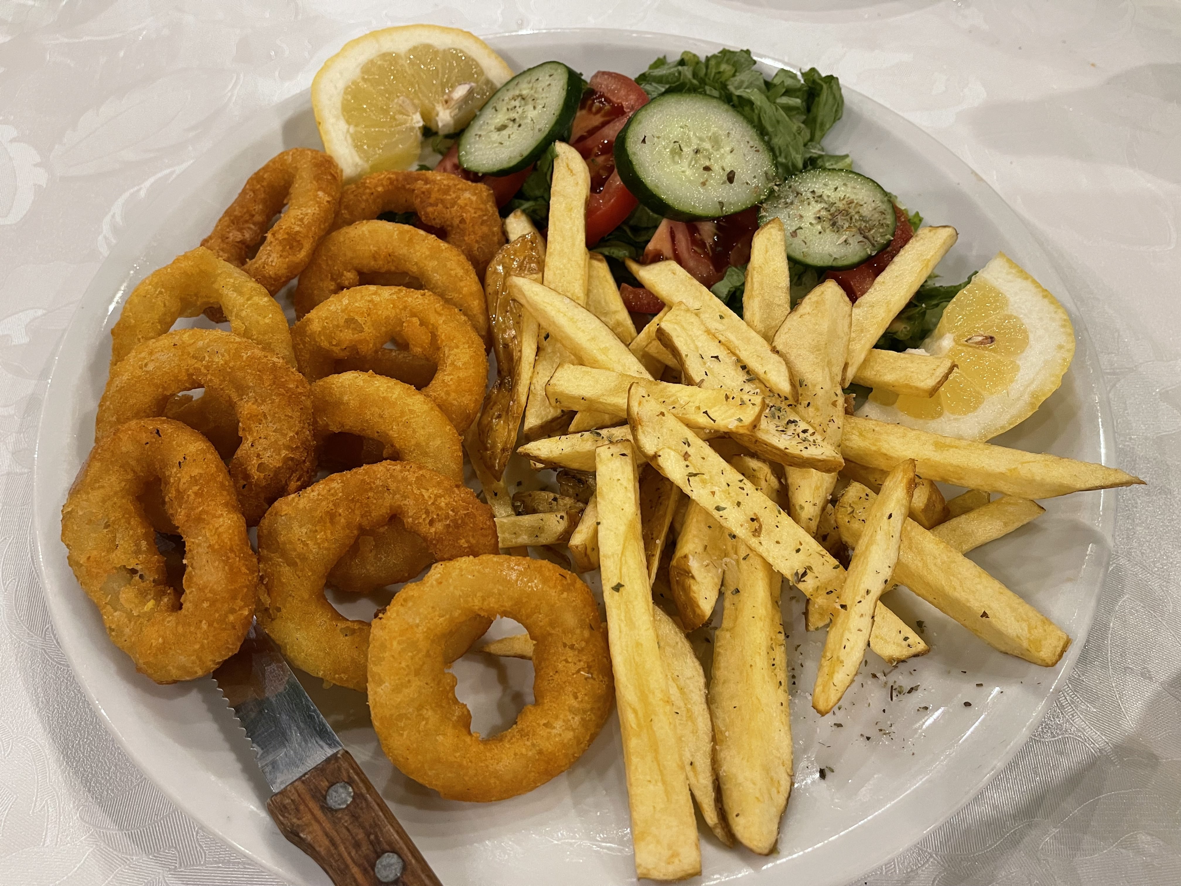 주요리도 얼핏 적어 보이지만 먹을 수록 양이 많다. 이렇게 먹고 나면 후식을 주문하지도 않았는데 후식 같은 것이 무료로 나온다. 아이스크림이나 수박 혹은 작은 케익이 나온다. 어느 한 식당은 소화시키는 데 도움이 된다면서 그리스 전통주(tendura)까지 덤으로 준다.