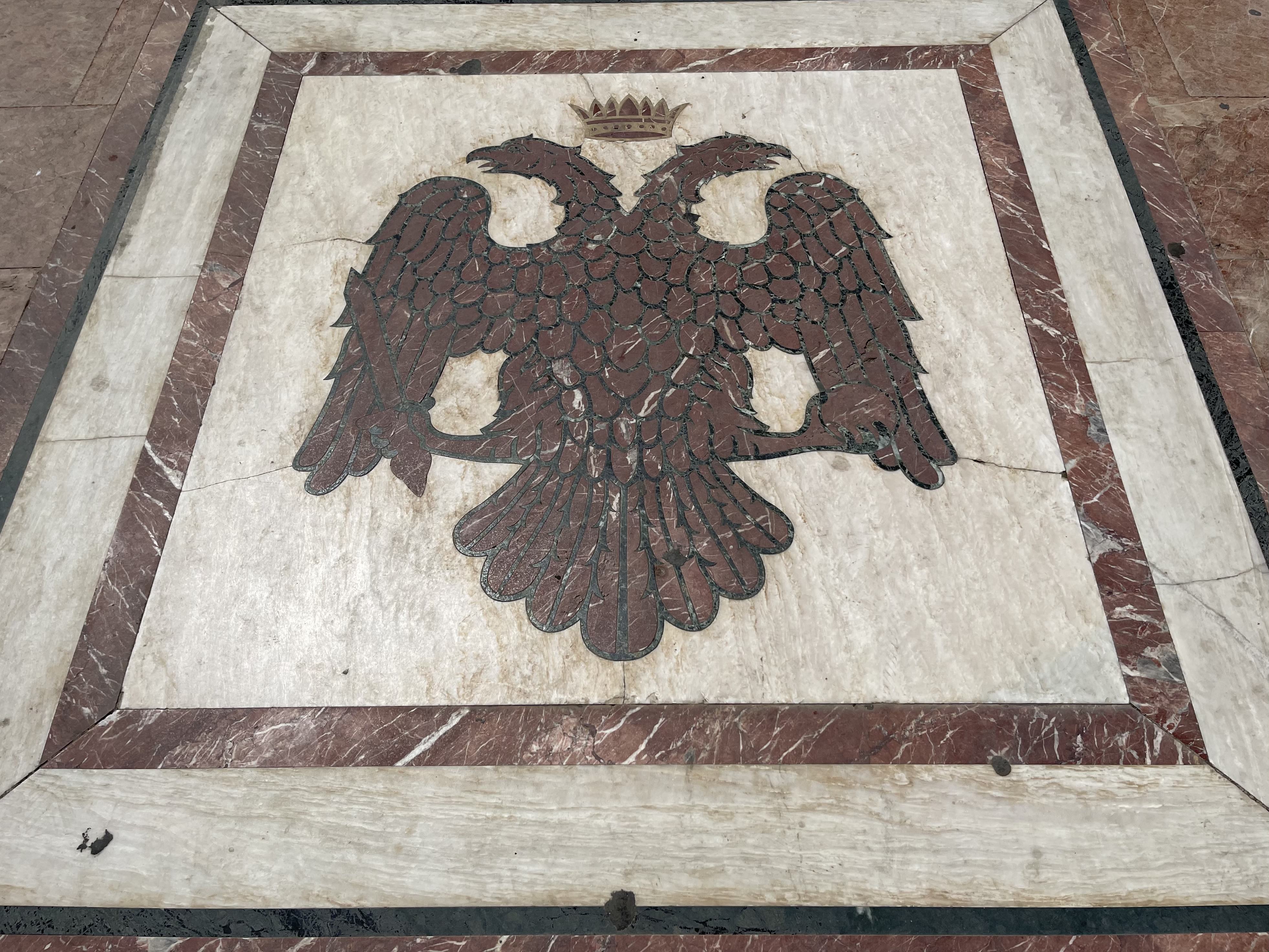 성당 앞 대리석 바닥에 새겨져 있는 큼직한 쌍두 독수리 문양은 콘스탄티노폴리스(오늘날 이스탄불) 중심으로 395년에 세워진 동로마 제국, 비잔티움 제국의 상징이다. 이 제국은 1453년 오스만에 의해 멸망하게 되었다.