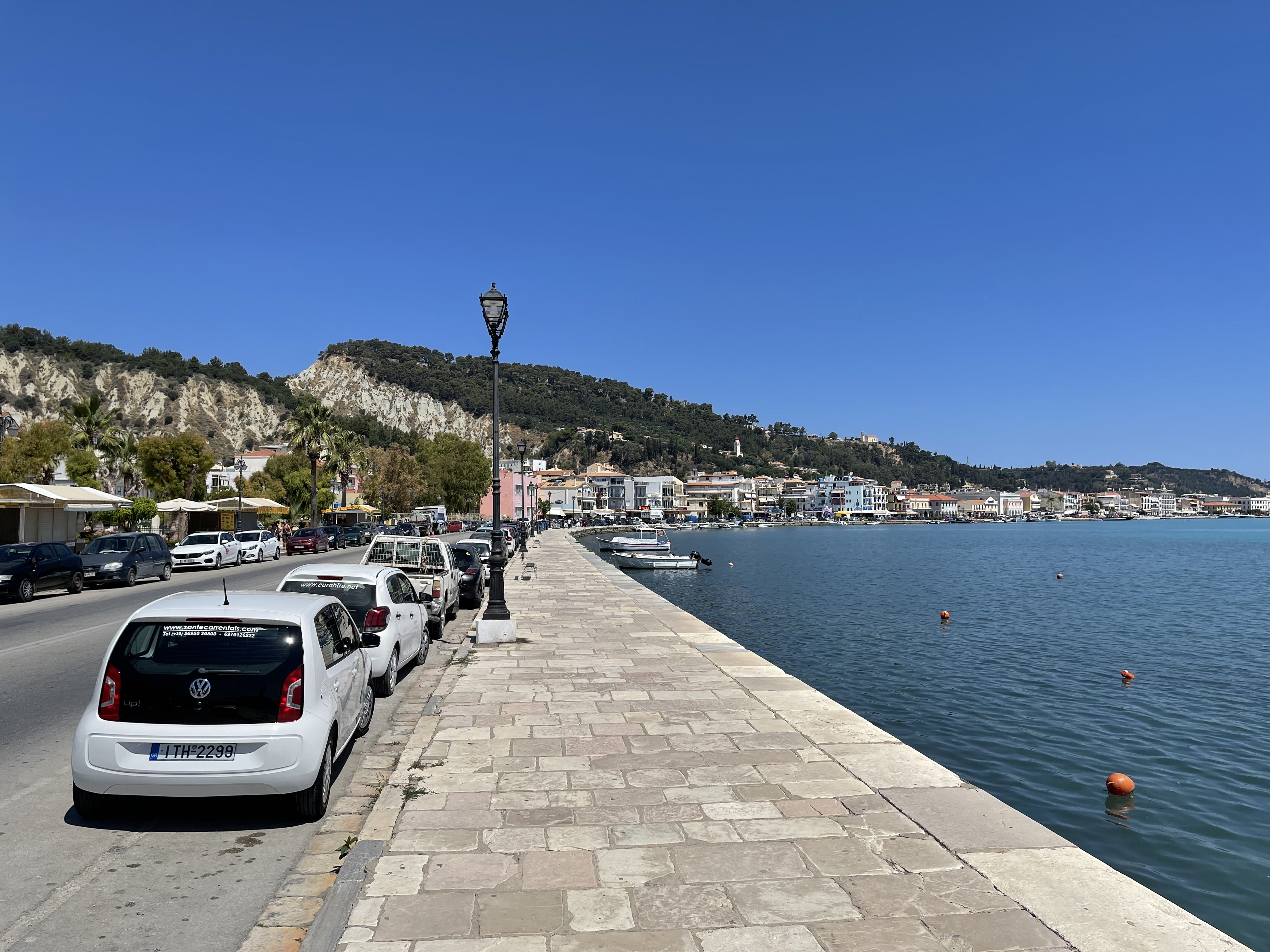 해변산책로 일부 구간은 현재 공사중이다. 청록빛 바다 속을 간간히 내려다보면서 성당 쪽을 향한다. 걸어온 길을 뒤돌아보니 산과 바다 사이에 길게 쭉 뻗어있는 자킨토스 시내가 한눈에 들어온다.