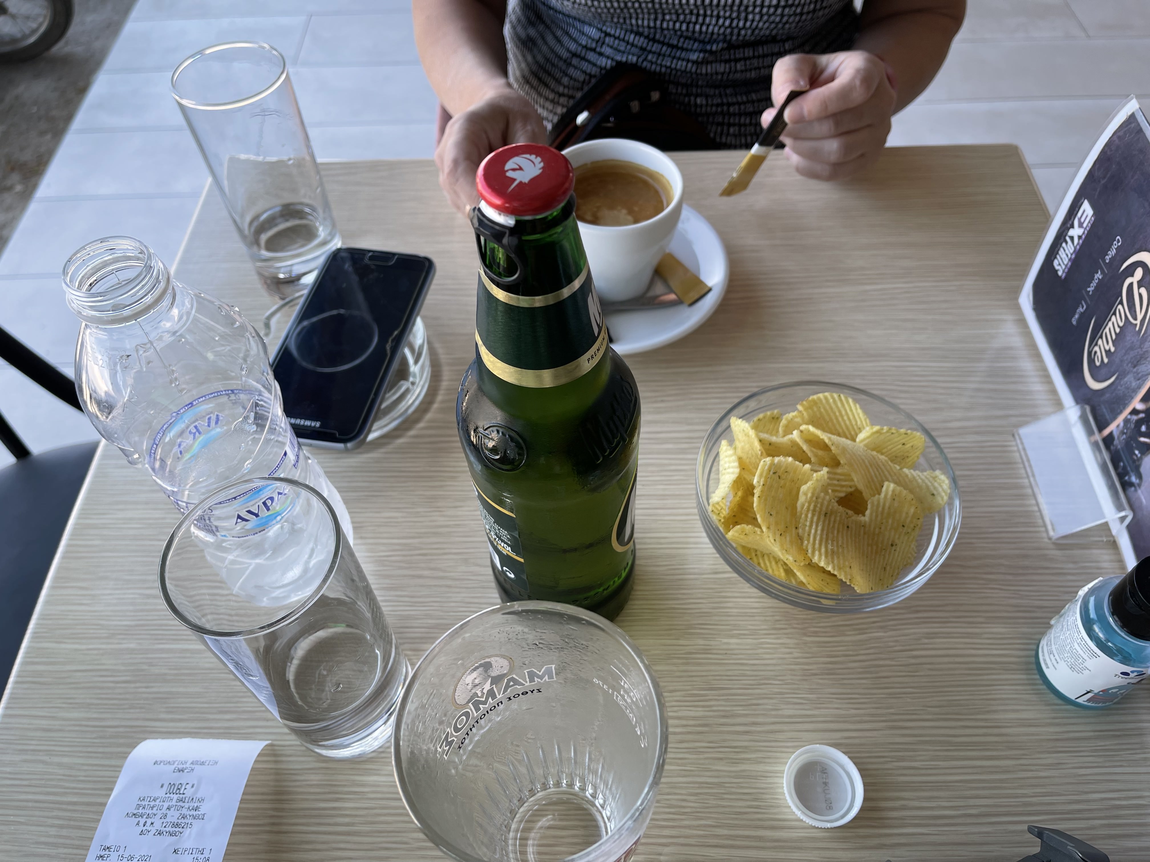 해변도로따라 이어져 있는 식당과 카페 중 한 곳에서 갈증 난 목을 잠시 축인다. 커피 한 잔 2.5유로(부가가치세 13% 포함), 맥주 500cc 한 병 3.5유로(부가가치세 24% 포함)다. 시원한 물 한 병과 감자과자 한 접시가 무료로 나온다. 공짜로 제공된 물에 감탄을 자아내지 않을 수 없다.