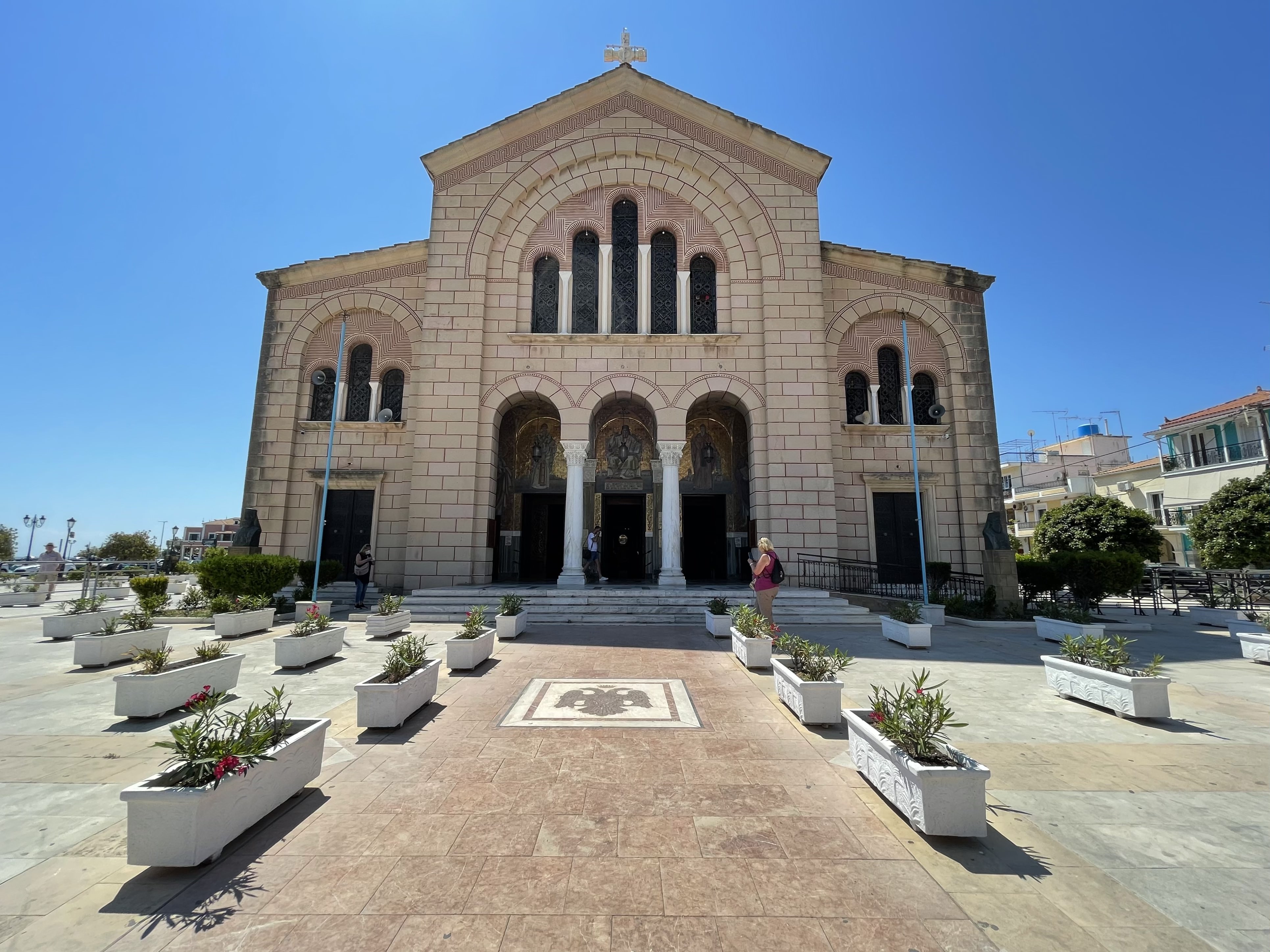 성인 디오니시오스 동방 정교회 성당(Saint Dionysios Orthodox Church) 전경이다. 성인 디오니시오스(1547-1622)는 이 섬에 태어나 동방 정교회의 대주교로 서임되었다. 그는 자킨토스 수호성인이다. 이 성당은 1925에서 1946년까지 20여년에 걸쳐 세워졌다. 1953년 6.8 강진에도 조금도 손상되지 않아서 주민들로부터 기적으로 여겨지고 있다.