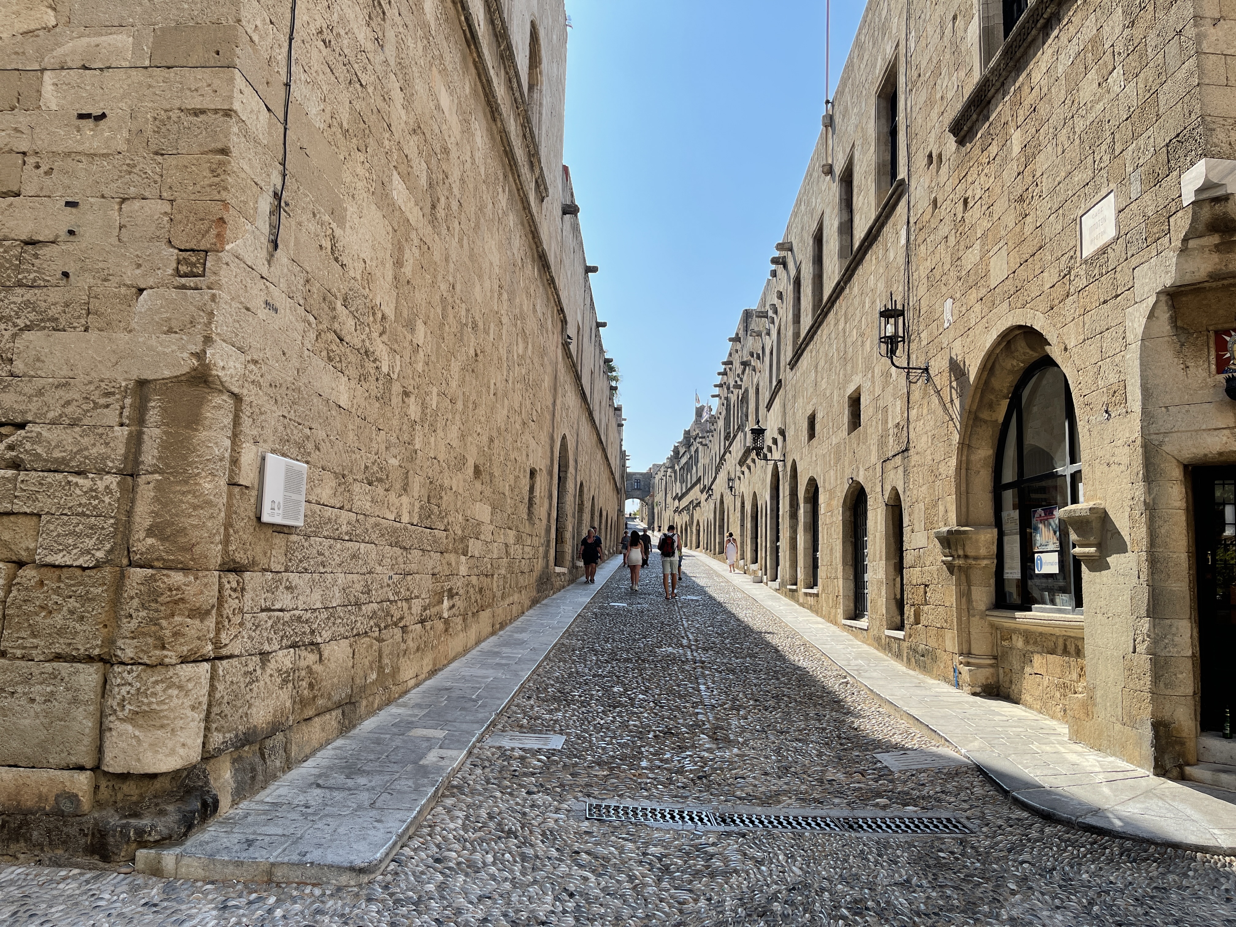 구시가지에서 가장 관광객들이 범람하는 거리인 기사단의 거리(Street of the Knights, Odos Ippoton)다. 기사단 병원(현재는 고고학 박물관)에서 기사단장 궁전(Palace of the Grand Master of the Knights)까지 거의 일직선으로 뻗어 있다.
