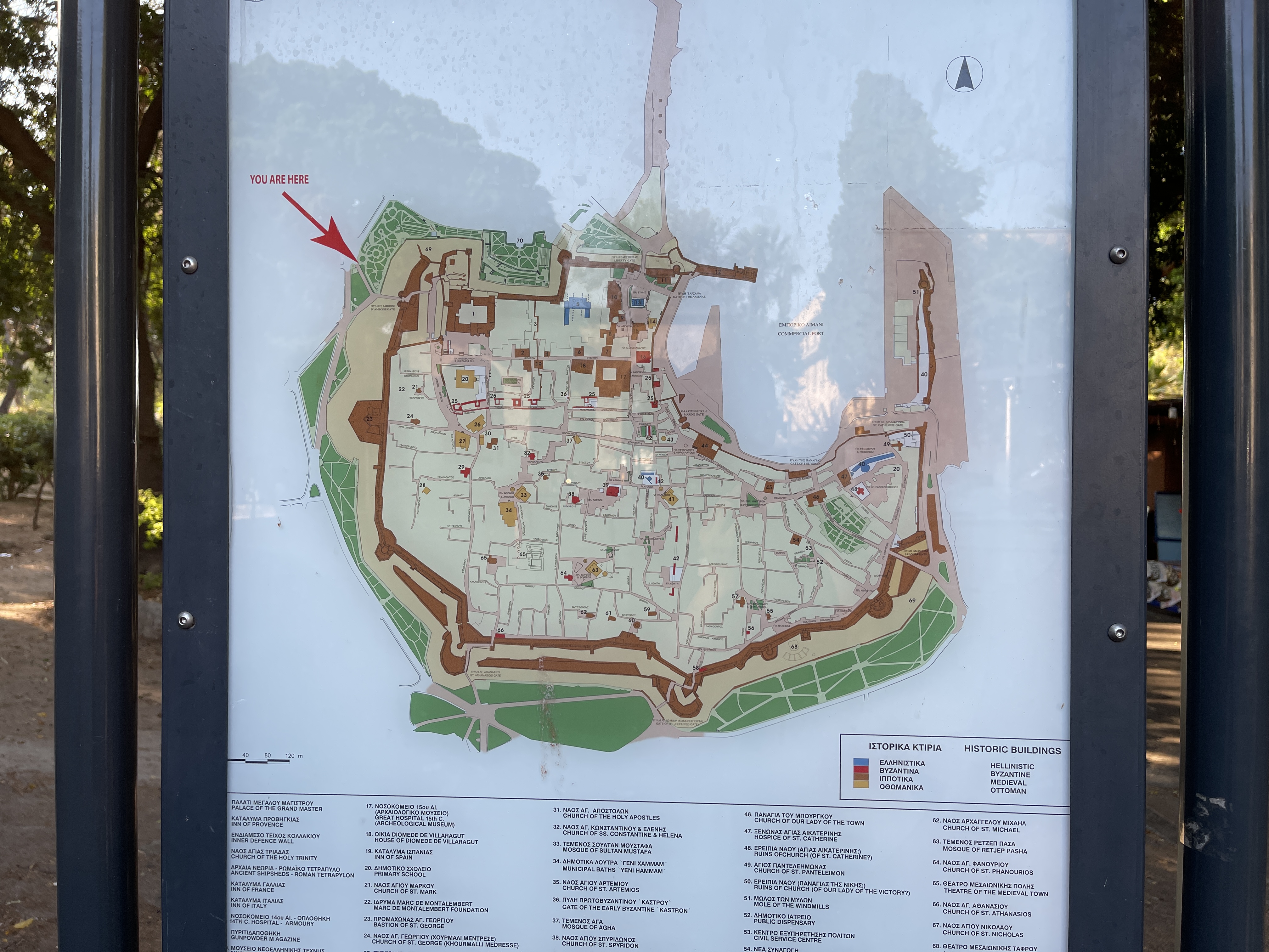 구시가지 성벽은 비잔틴 제국 시대의 방어벽 위에 세워졌다. 성 요한 기사단에 의해 보수되고 증축 추가되었다. 총 4킬로미터에 이른다. 군데군데 옹성과 방어탑을 구경하면서 성벽 해자를 따라 쭉 산책해본다.