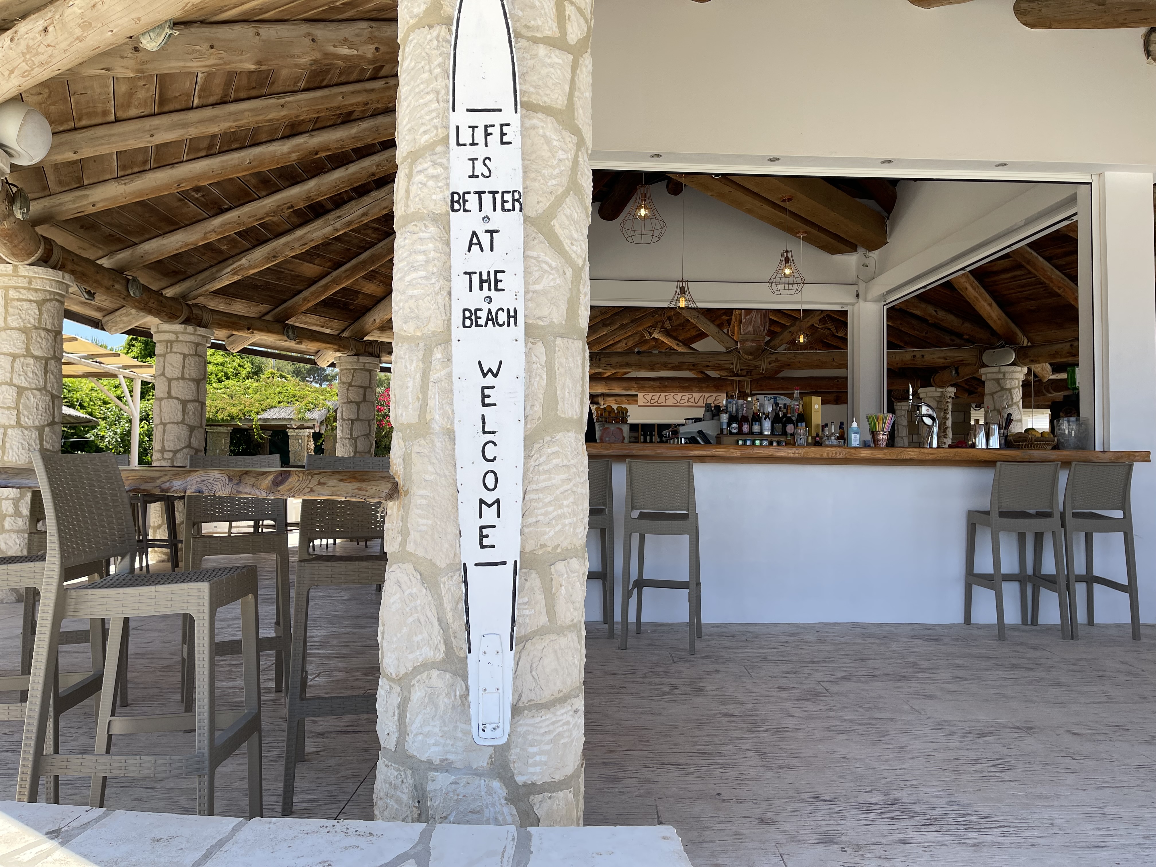 카페에서 보라본 해수욕장 전경이다. 좌우로 빼곡 설치되어 있는 해양산(파라솔)은 극히 일부를 제외하고는 텅 비어 있다. 예전 같으면 관광객들로 붐비었을 텐데 말이다. 해양산은 주로 왕갈대(arundo donax)로 만들어졌다.
