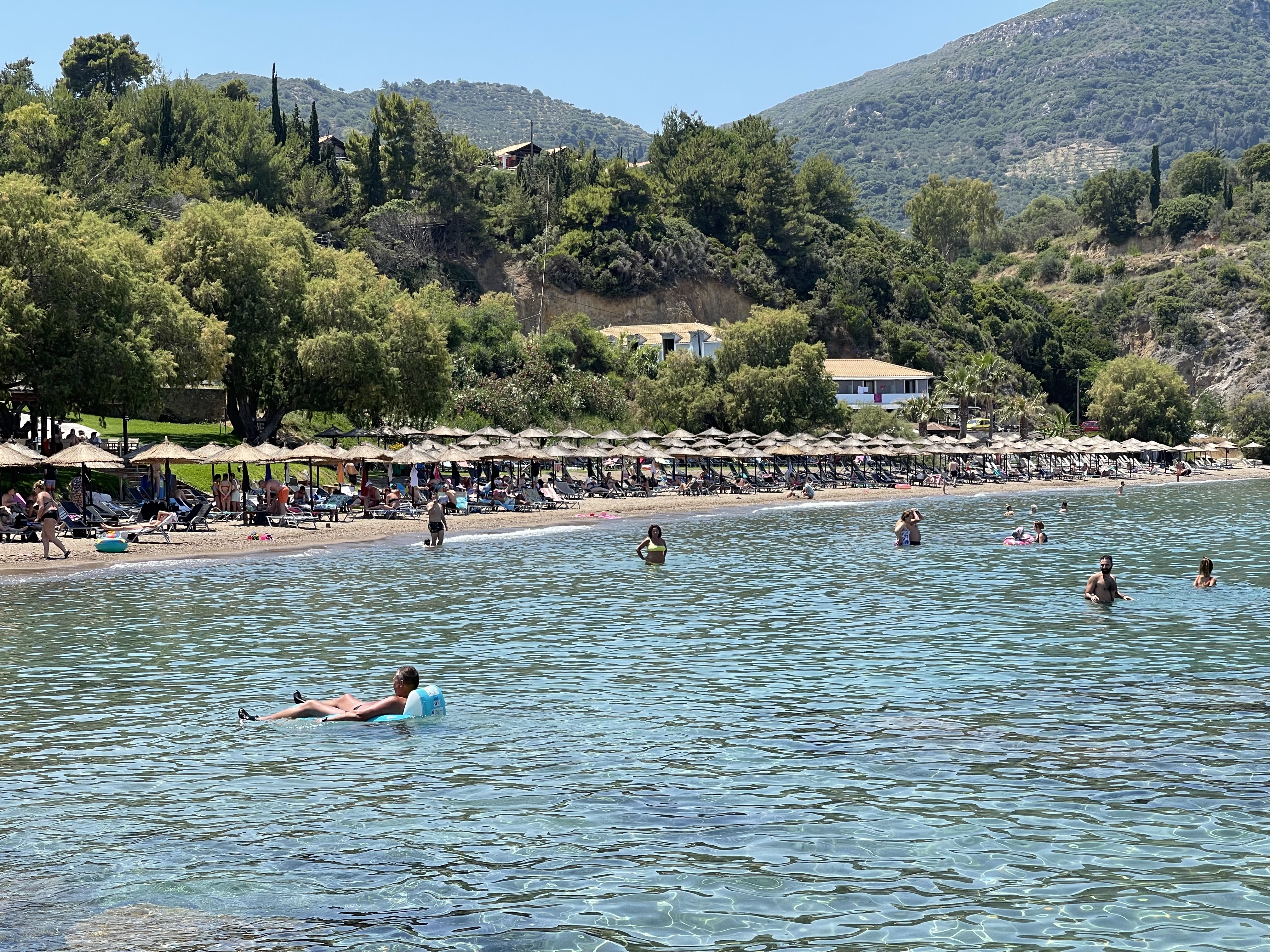 모래 해수욕장이지만 해변쪽으로 갈수록 자갈이 섞여 있다. 바닷물 속에도 자갈이 많이 섞여 있다. 저 멀리 수평선 넘어 희미하게 보이는 곳이 그리스 펠로폰네소스 반도다.