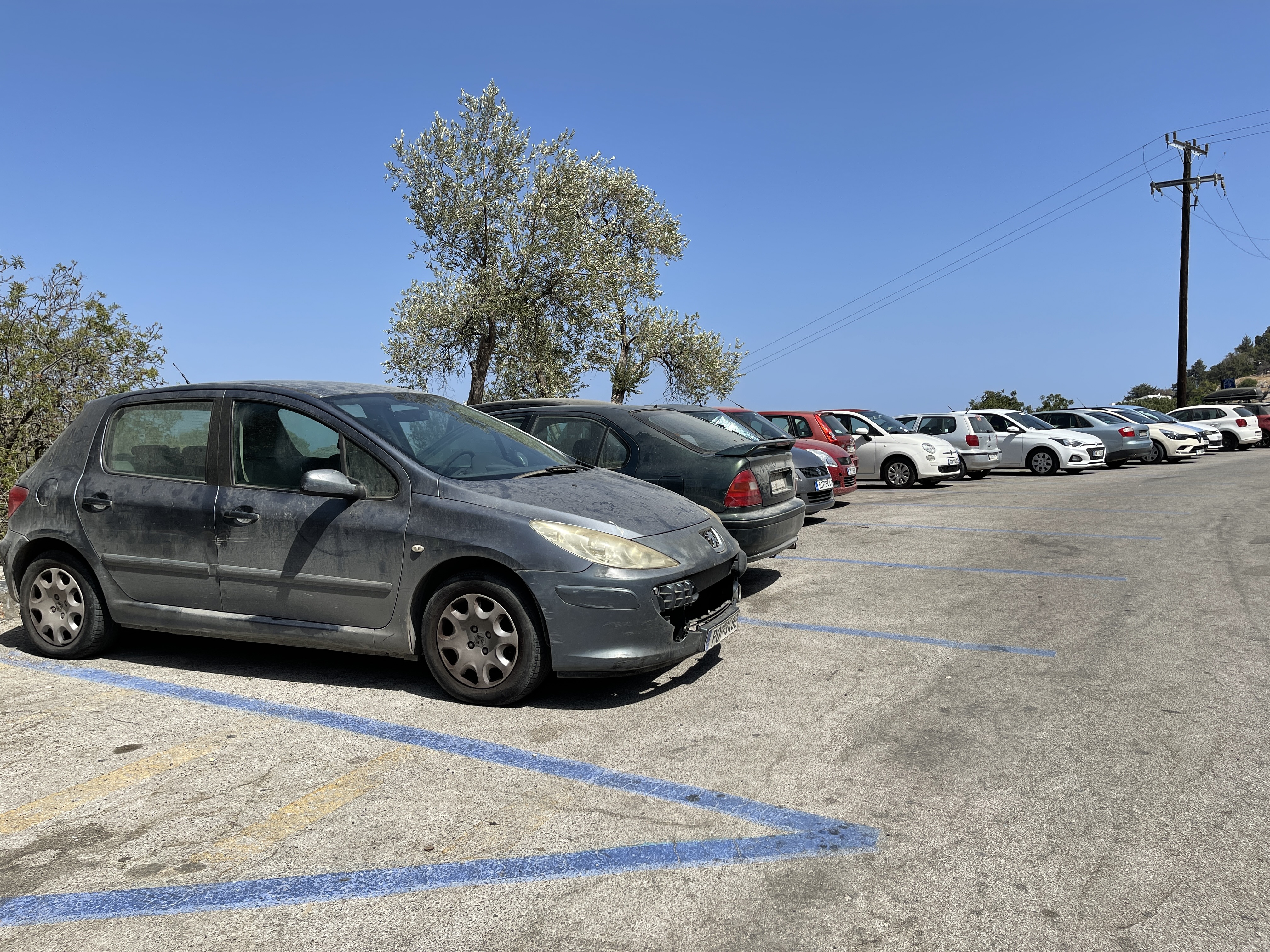 마을 안으로 들어가니 주차공간을 찾을 수가 없다. 그리스 주차제도는 이렇다. 도로에 파란 주차선이 그어져 있으면 유료다. 지역마다 시간별 주차비가 다르다. 노란 주차선은 상업용차, 경찰차, 관광차만 주차할 수 있다. 하얀 주차선은 무료다. 로도스 섬은 로도스 도시와 린도스를 제외한 곳은 대부분 무료 주차다.