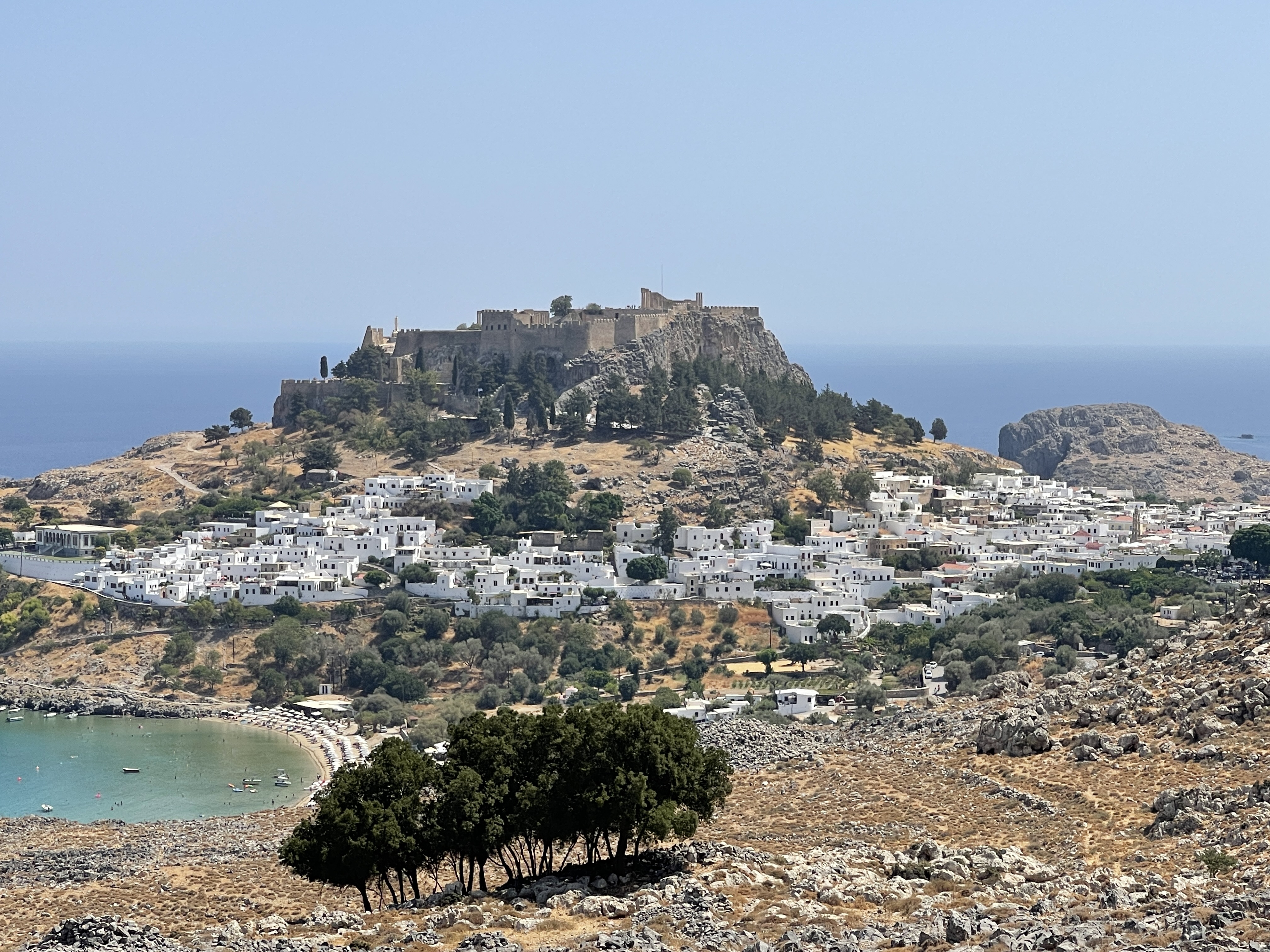 남쪽에서 바라보는 린도스 전경이다. 바위산 정상에 세워진 아크로폴리스의 위용이 더욱 돋보인다.