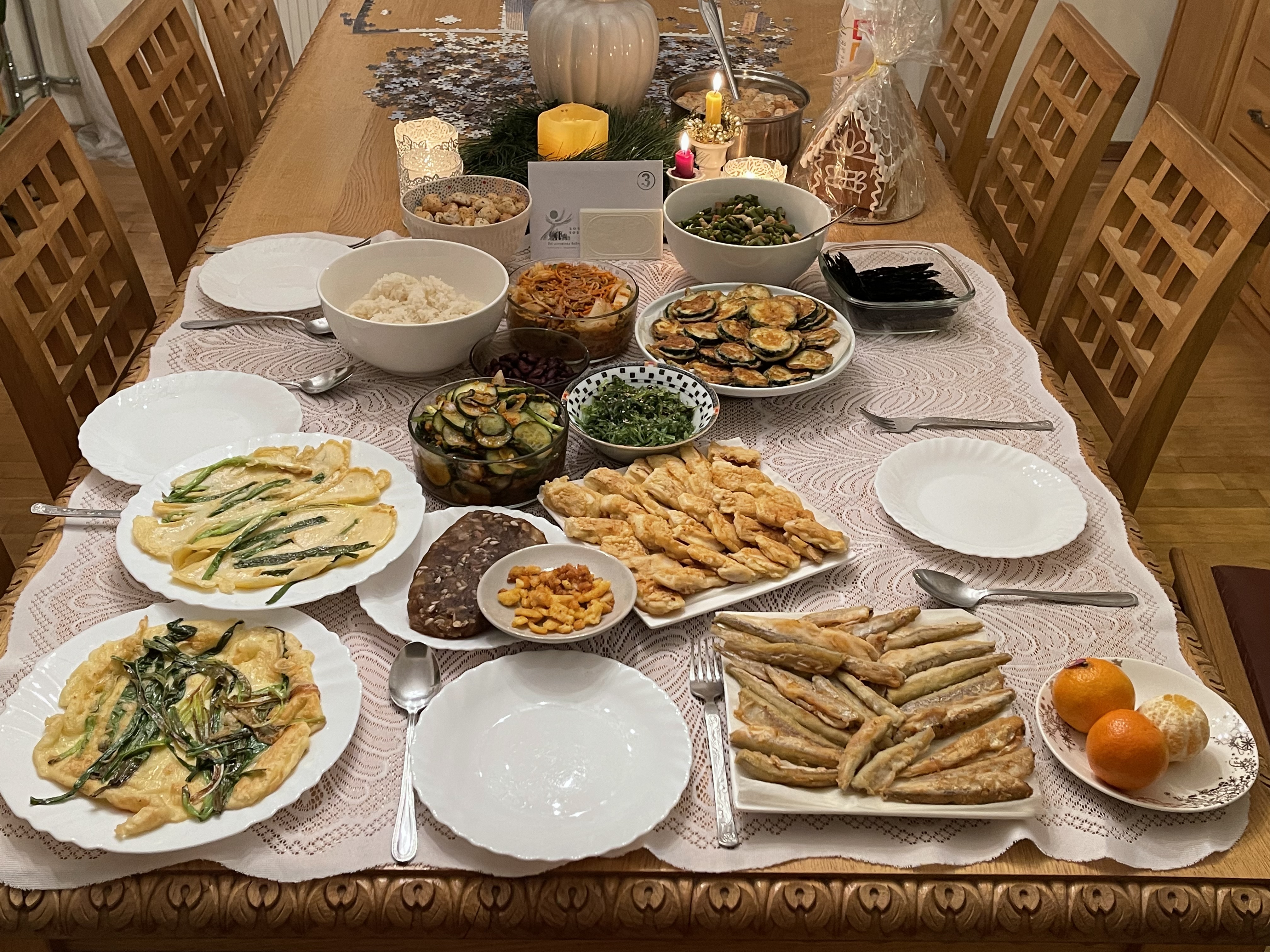 다행히 냉동실에 대구와 바다빙어가 있었다. 리투아니아 크리스마스 전야 음식에 생선이 빠지만 안 된다. 리투아니아를 비롯한 폴란드, 체코 등 중동유럽 나라들은 생선 중 주로 잉어를 먹는다. 그리고 반드시 12가지 이상 음식이 준비되어야 한다. 숫자 12가 가지는 의미는 다양하다. 예수님의 제자가 12명이고, 1년은 12달로 되어 있고, 하루는 낮과 밤 각각 12시로 되어 있다. 크리스마스 전야에 12가지 음식을 먹어야 1년 12달 배고프지 않고 건강하게 잘 살 수 있다고 믿는다.