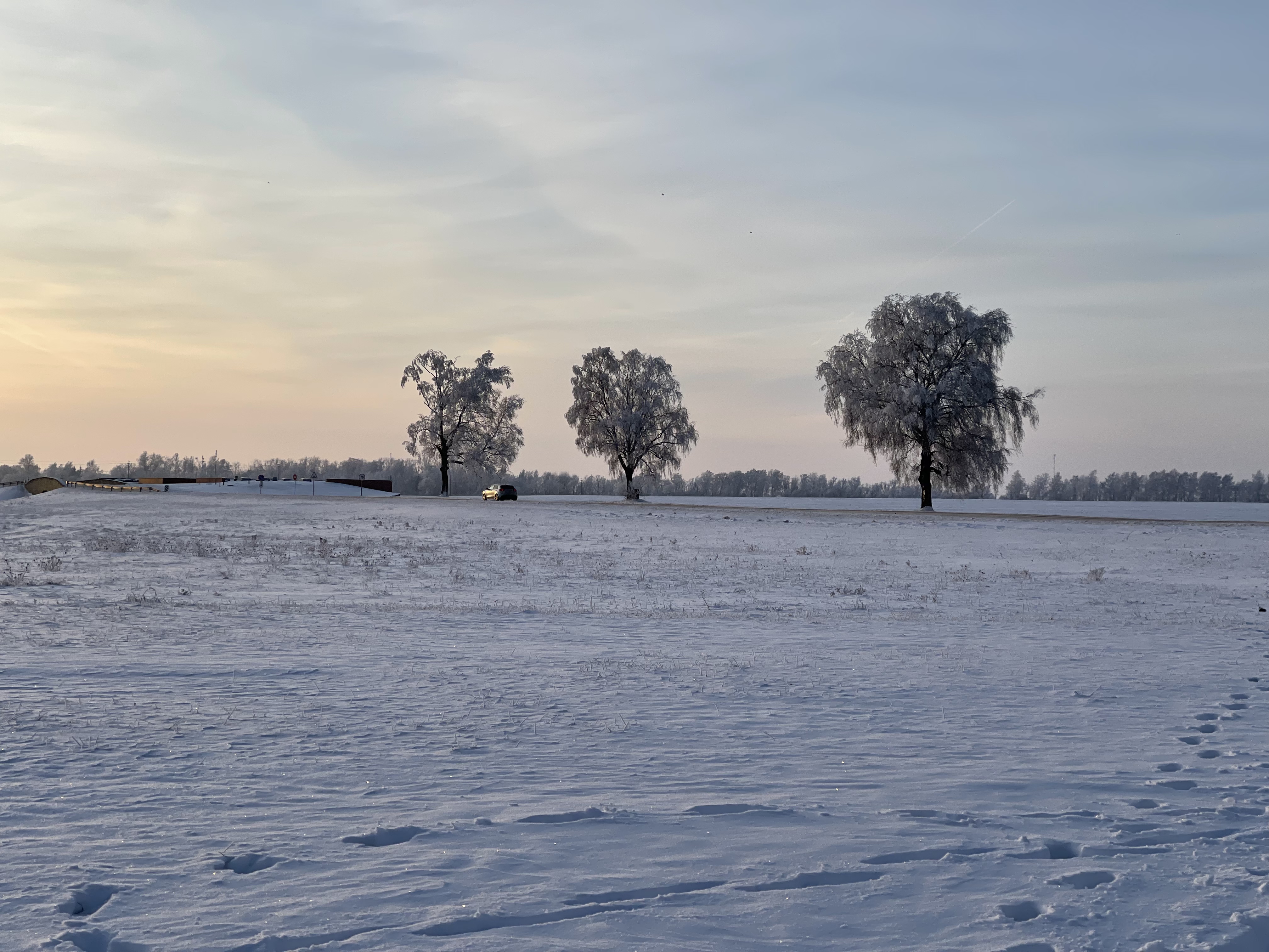 도롯가에 나무 세 그루가 광활한 초원과 들판 사이에 우뚝 서 있다.