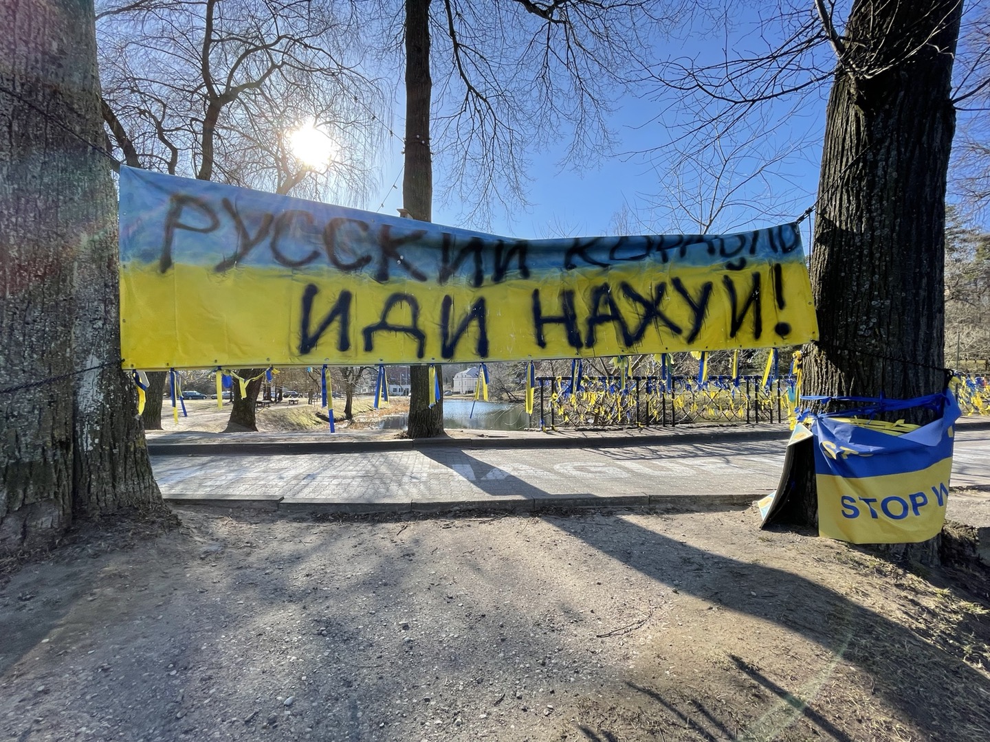 러시아 대사관 앞 작은 호수 주변 나뭇가지에는 우크라이나 국기 띠들이 매달려 바람에 나부끼고 있다.