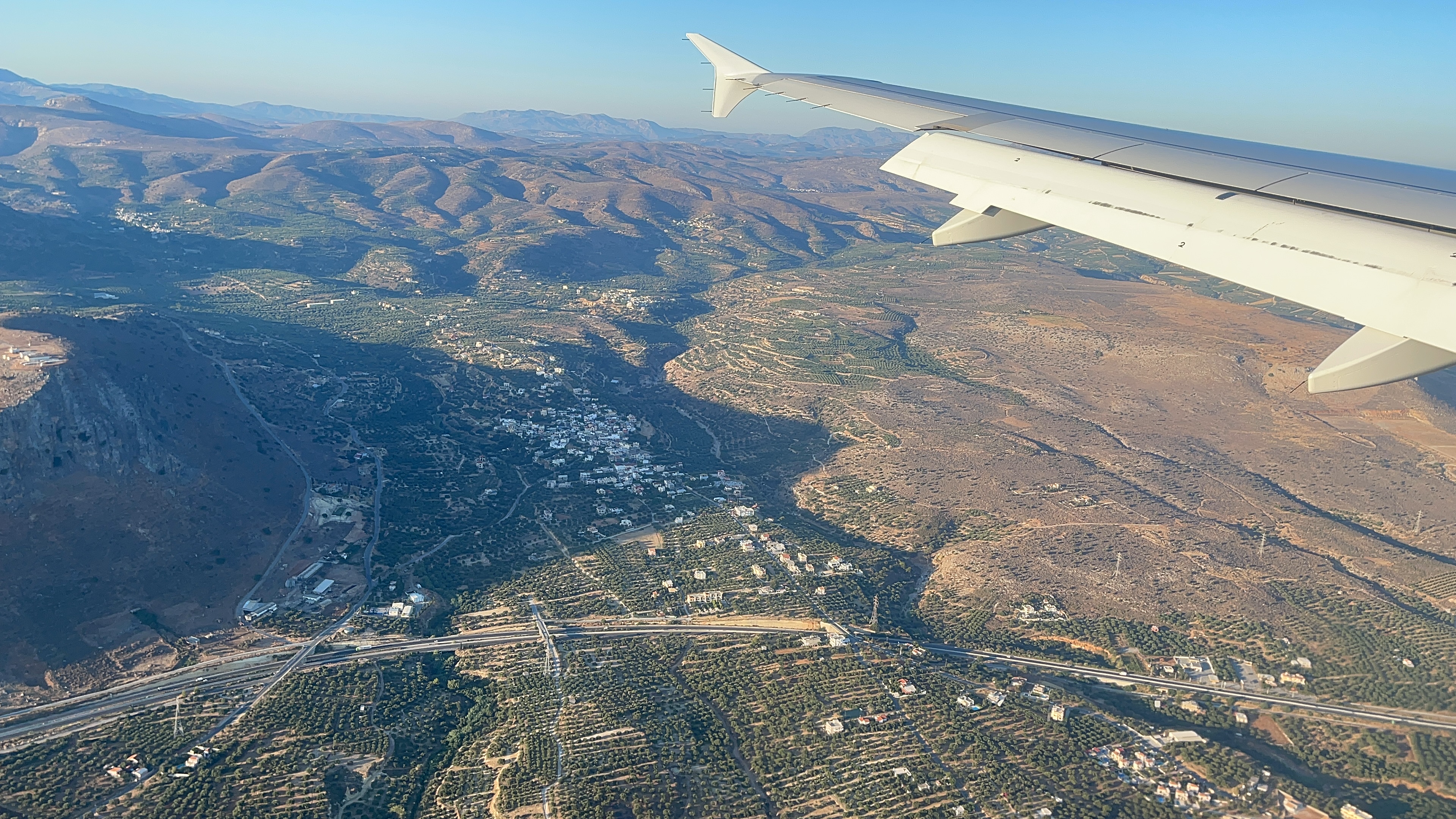 붉은 태양이 솟아오른 후 얼마 지나지 않아 에게해가 눈 아래 펼쳐지고 이어서 올리브밭으로 짜집기 된 크레타 섬이 한눈에 들어온다. 3시간 비행 후 크레타 이라클리온(헤라클리온) 국제공항에 도착한다. 쉥겐조약국이라 입국심사가 없으니 만사가 일사천리다. 짐을 찾고 나가서 여행사 직원의 안내를 받아 대기한 버스를 타고 호텔로 향한다.