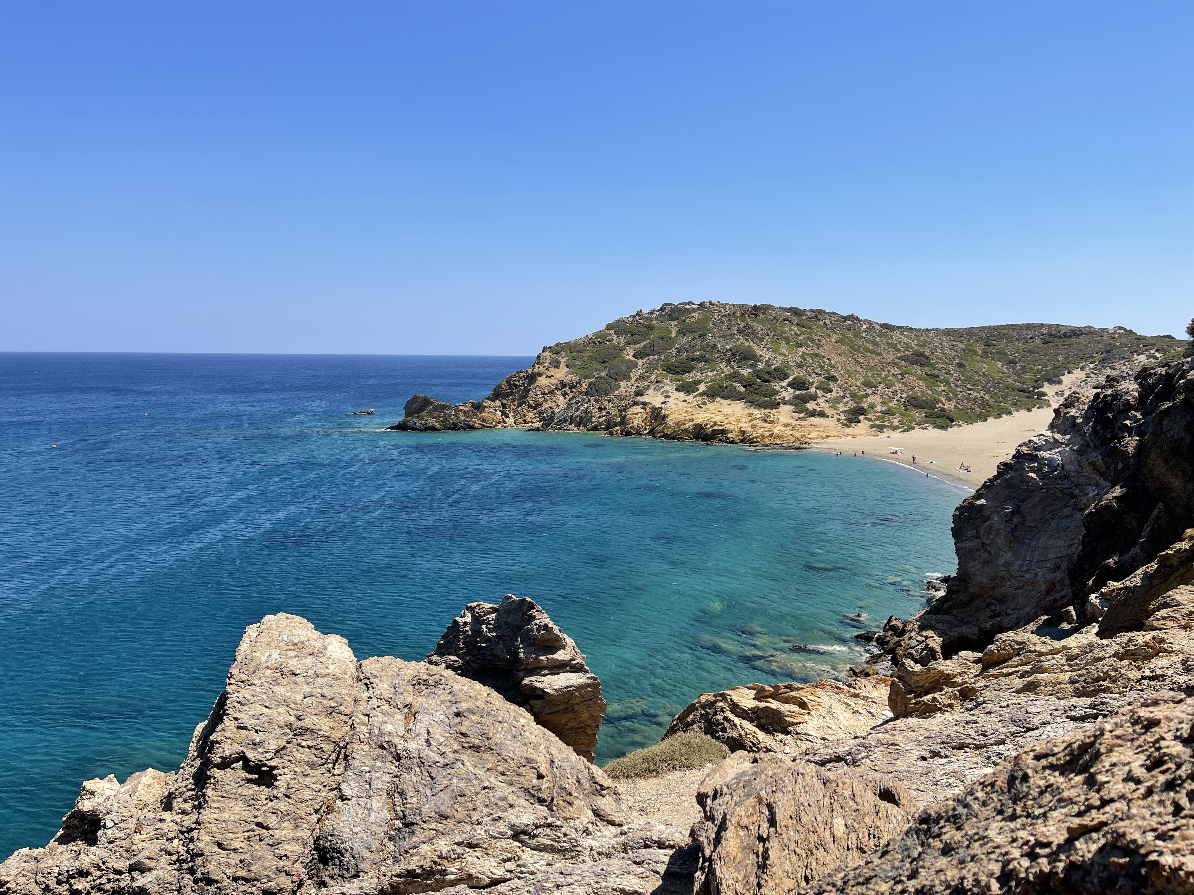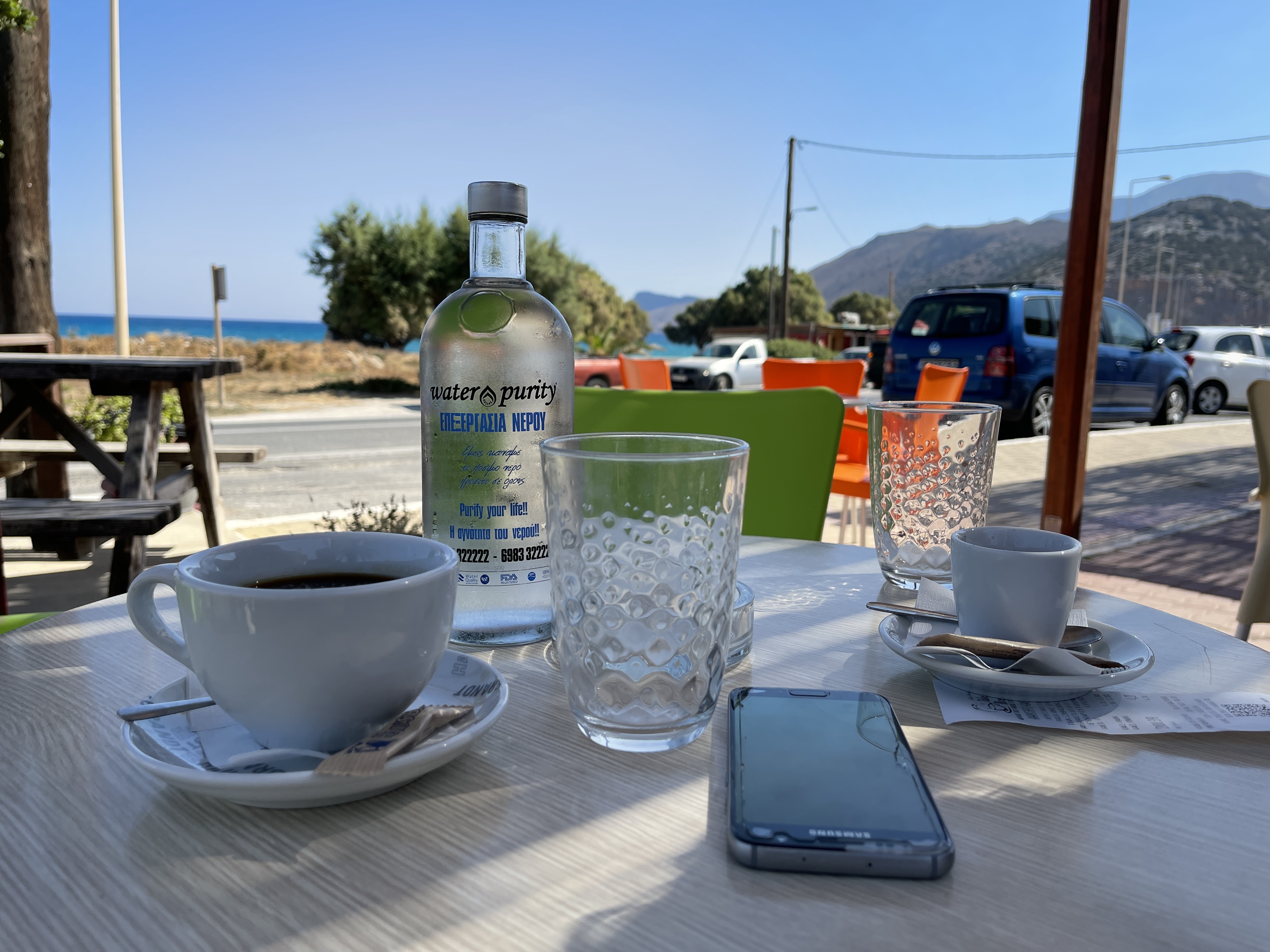 첫날 목적지는 크레타 동쪽 끝에 위치한 바이 해수욕장(Vai Beach)다. 구글 지도상 걸는 139km다. 소요시간은 2시간 20분이다. 리투아니아에서는 1시간 10분 걸리는 거리다. 산악도로가 굽이굽이 이어지고 있음이 쉽게 짐작된다. 이날 이동 거리의 딱 반인 곳(Pachia Ammos Beach Παραλία Παχιά Άμμος)에서 오전 커피를 마신다.