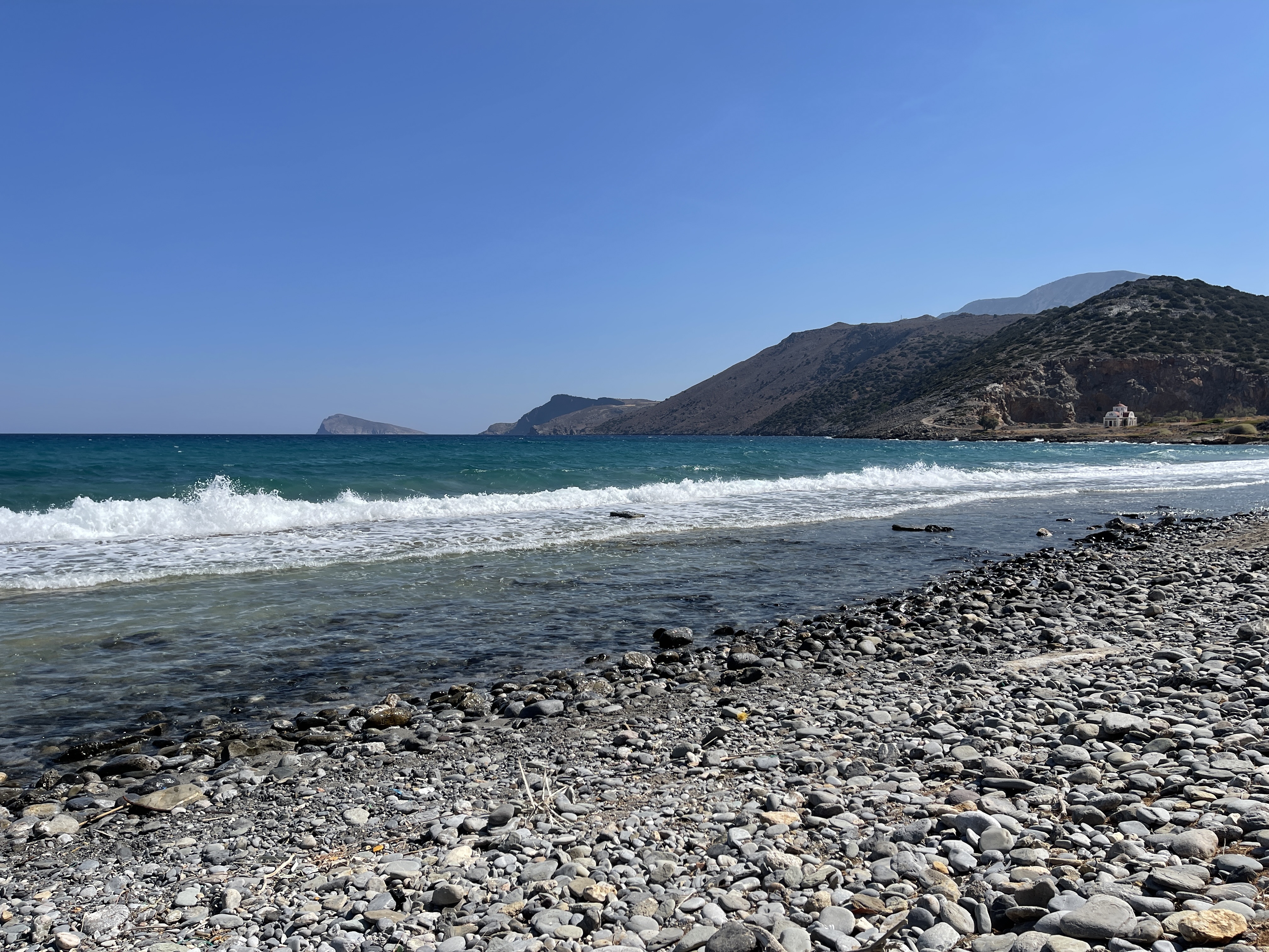 오른쪽에 보이는 저 산들을 넘고 넘고 또 넘어야 시티아(Sitia) 도시가 나온다. 산은 민둥민둥하지도 않고 울창하지도 않지만 소나무 등으로 푸르거나 올리브나무 밭으로 이루어져 있다. 잠시 쉬는 곳의 해변은 조약돌 해변이다. 파도가 심하게 일어 해수욕하고자 하는 마음이 선뜻 내키지 않는다.