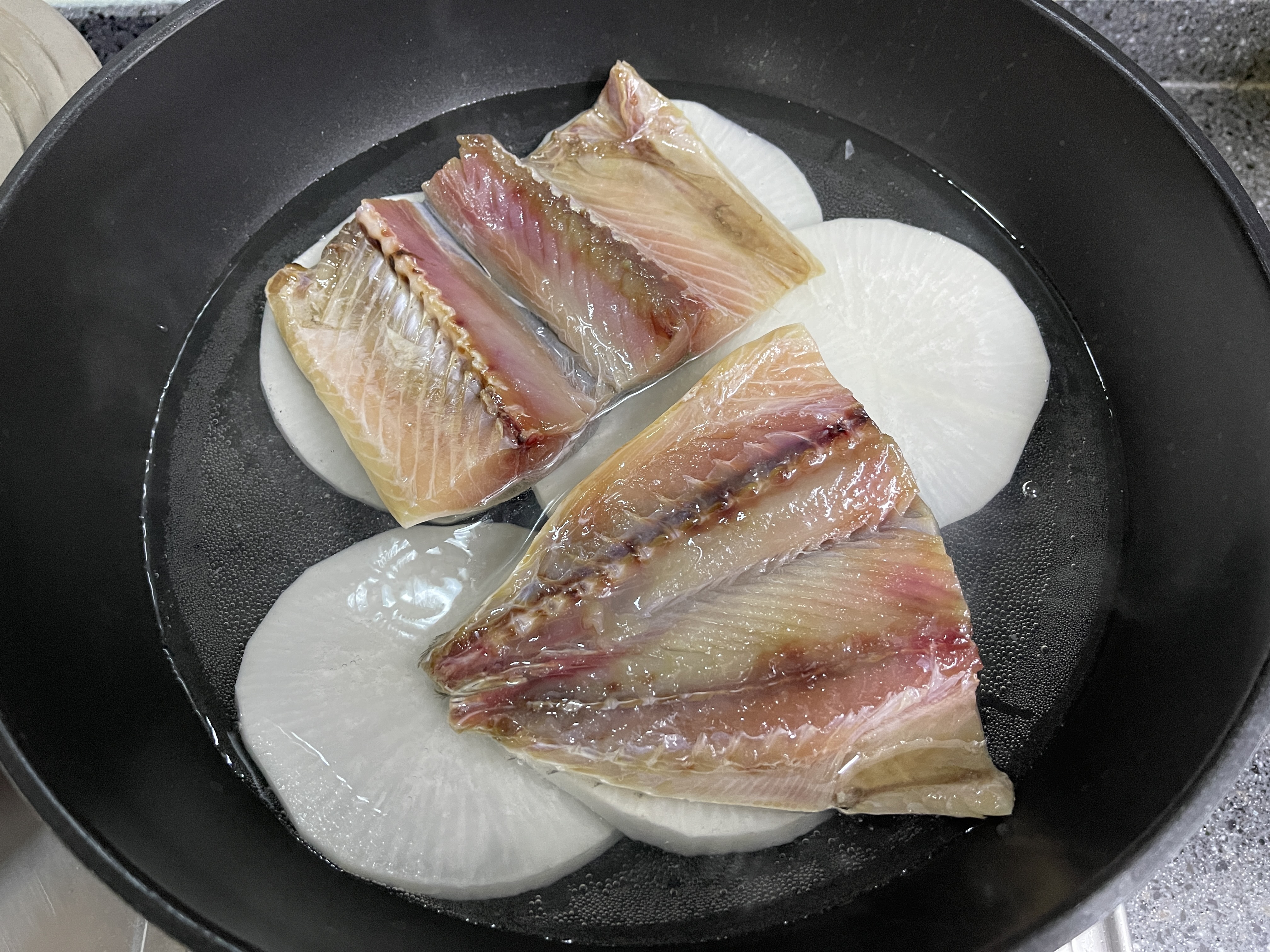 무우 위에 조각을 낸 고등어를 얹는다.