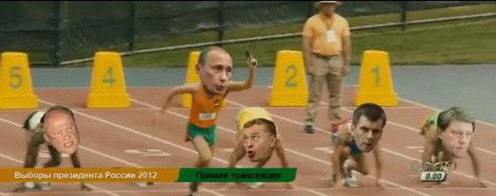 대통령 선고를 100m 달리기에 비유했다. 달리기 선수인 푸틴이 먼저 출발한 후 출발을 알리는 총을 직접 쏜다. 이어서 그는 뒤따라오는 선수들을 향해 총을 쏜다. 결승점에 도달하기 전 결승점에서 띠를 잡고 있던 사람들이 푸틴을 향해 결승점 띠를 가지고 달려온다.