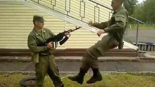 한 군인이 AK-47 소총을 겨누고 있다. 앞에 선 동료가 순간적으로 몸을 약간 뒤로 제치면서 오른발로 밑에서 위로 살짝 탄창을 찬다. 그러자 탄창이 맥없이 소총에서 떨어진다.